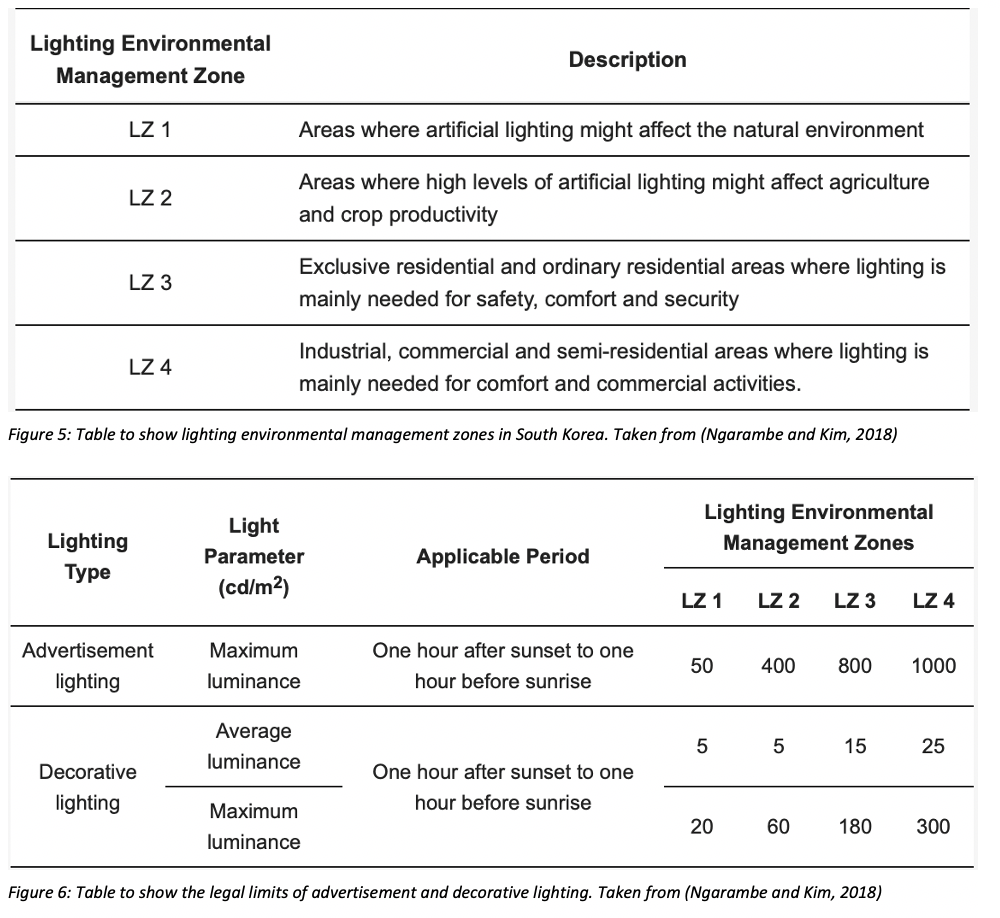 Whilst street lighting is considered the biggest threat to insects, the presence of advertisement and decorative lighting shouldn’t go under the radar. In Seoul, South Korea, they have lighting environmental managements zones with limits for each zone, as shown in figures 5 and 6 below. In their study, Ngarambe and Kim (2018) found that in residential areas nearly 40% of advertisement exceeded the legal limit, and in semi-residential, industrial and commercials areas, 28%,39% and 30% exceeded the limit. For decorative lighting in the 4 zones they all exceed the legal limit also. This study can be supported by one done by Zielinska-Dabkowska and Xavia (2019) in Bahnhofstrasse, Switzerland who found a luminance value of 2151 cd/m3, 86 times the limit for that region. Whilst this may seem like legal limits on lighting is a bad idea, these studies highlight the importance for further and better regulation on the matter. Street and security lighting designers are advised by professionals on situations such as the Illuminating Engineering Society, that they should use full cut-off or semi cut-off luminaries in order to minimize the dispersal of lighting (Ngarambe and Kim, 2018). No such advice exists for advertisements
