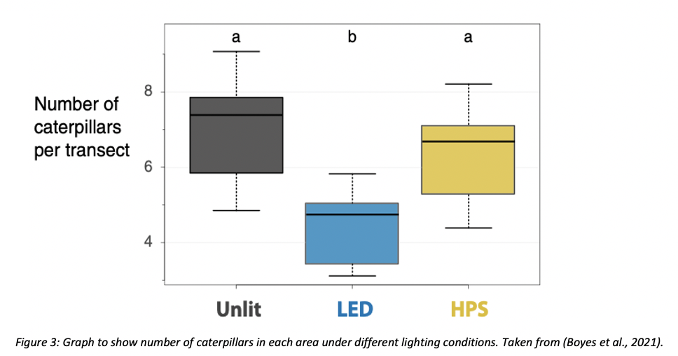 In a study done looking at the impact of ALAN on moth caterpillar numbers it was found that in the presence of street lighting there was a reduction of nearly one half in caterpillars in hedgerows and a reduction by 1/3rd in grass margins (Boyes et al., 2021). Interestingly, as shown by figure 3, the HPS and unlit transects are actually very similar, whereas LED is significantly lower. Feeding behaviour of caterpillars being disrupted by LED lighting and not HPS lighting can be concluded from this study.