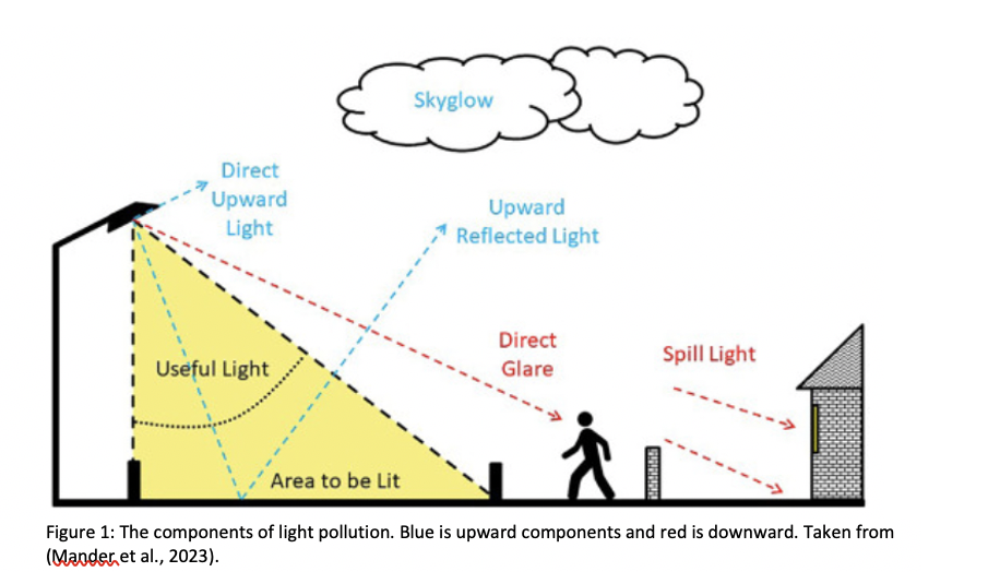 Light pollution comes from artificial lights used to light streets and homes, emitting light to the lower atmosphere which will then stay there due to aerosol particle concentration (Rodrigo-Comino et al., 2021). It’s been found by most light pollution researchers an average of 15% reflectivity is representative of illuminated surfaces like concrete (Green et al., 2022). Figure 1 below, shows a clear breakdown of what light pollution is, where the upward reflected light, combined with the direct upward light causes skyglow (Mander et al., 2023). Even though at times skyglow can be so faint that humans can’t see it, it has the potential to threaten 30% of vertebrates and 60% of invertebrates that are nocturnal or sensitive to light (Irwin, 2018).