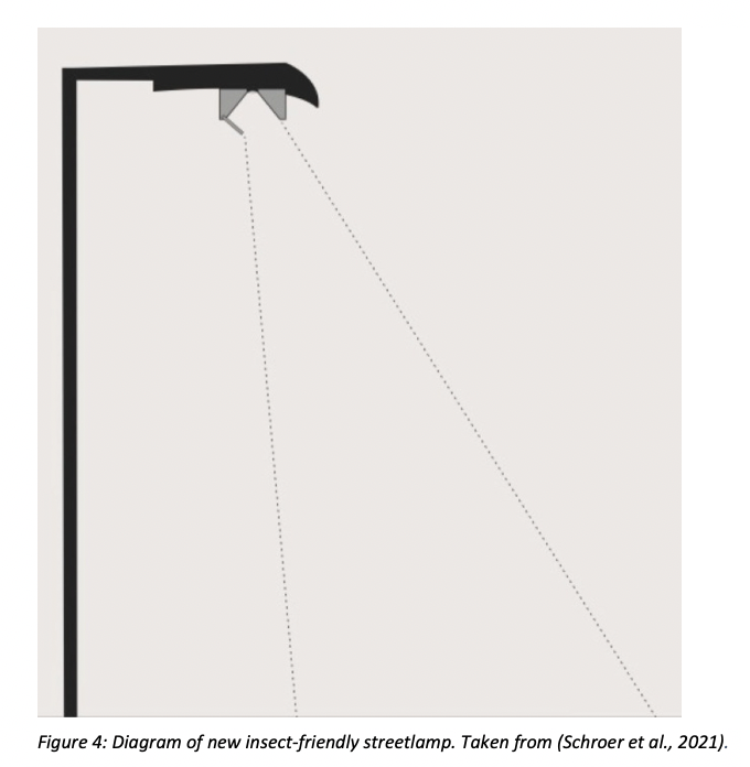 Project “Tatort Streetlight” is a project which looks at 4 German cities and aims to use insect friendly lighting design (see figure 4), as well as promote mutual exchange of topics and obstacles and highlights issues, and provide a clear connection pathway between research and applied knowledge (Schroer et al., 2021). The insect friendly streetlight will direct light only where it is needed with a wide angle at the targeted area and shielded light source using shutters. The aim is that it won’t be visible from water bodies, floodplains or other habitats. With moths being attracted to HPS from over 20m away as well as cassis flies and mayflies being attracted from 40m, this project will aim to reduce attraction and the barrier effect by improving light distribution geometry (Schroer et al., 2021).